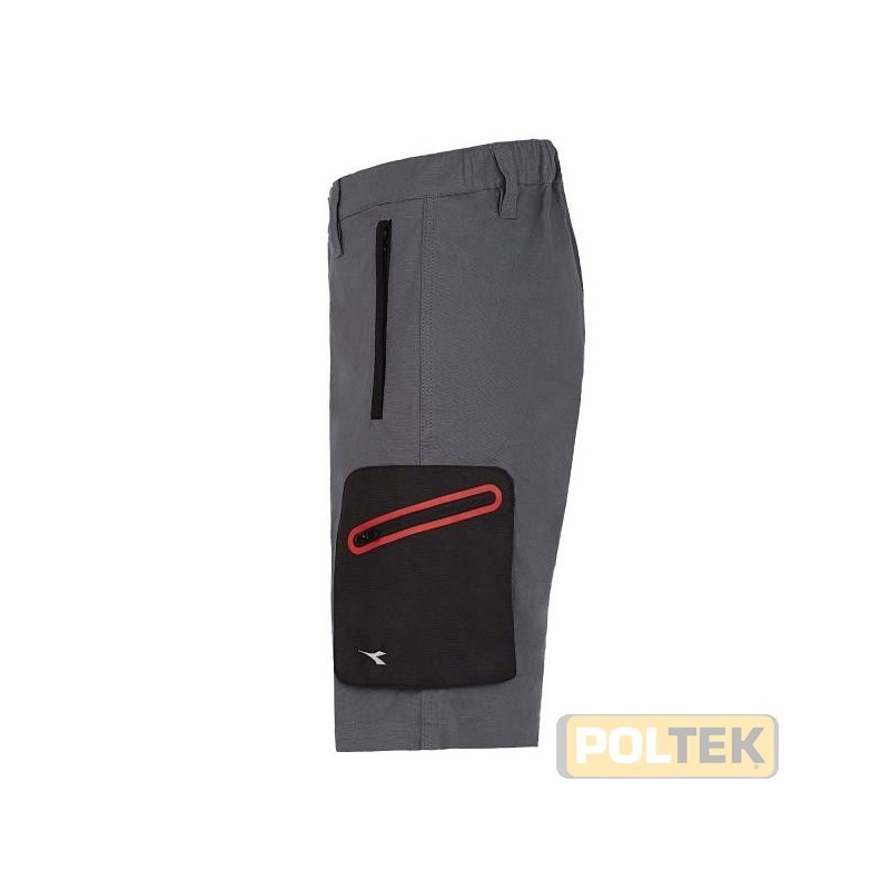 Bermuda in cotone canvas elasticizzato con tasca laterale zippata e dettaglio termonastrato rosso. Elastico in vita, portametro e portamartello, tripla cucitura.