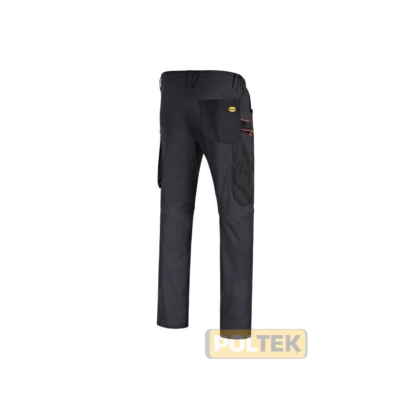 Pantalone in cotone canvas elasticizzato con tasche frontali aperte. Tasca laterale con soffietto, zip e dettaglio termonastrato, tasca sul retro, portametro e portamartello in poliestere Oxford, tasche porta ginocchiere rinforzate in Oxford, chiuse sul fondo con velcro, dettagli fluo. Elastico in vita, bottone antigraffio, slim fit, gamba ergonomica, tripla cucitura.