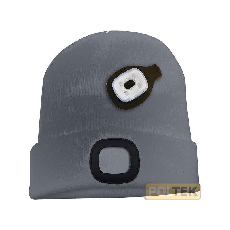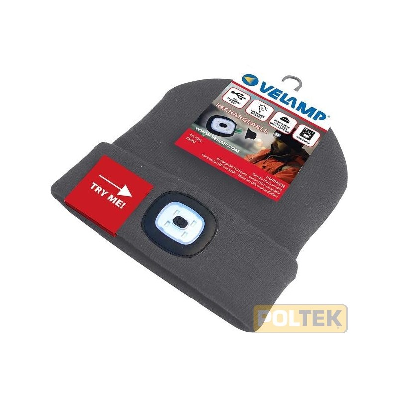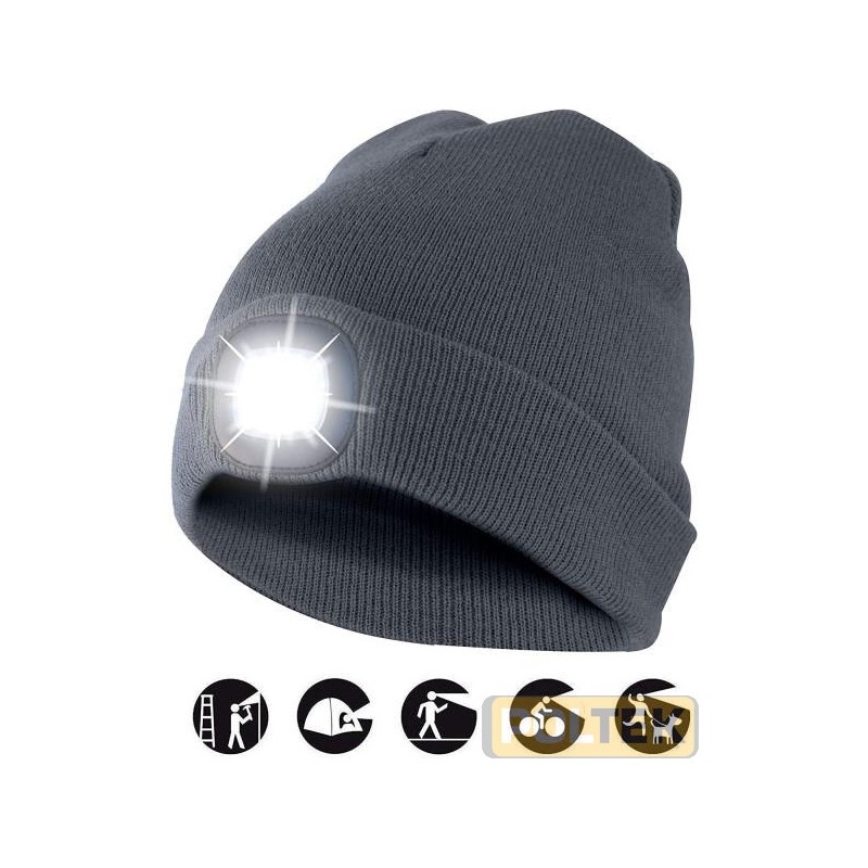 100 lumen SMD LED Distanza luce m.20 Durata 2 ore Ricaricabile da porta USB. Batteria Lithium polymer 250 mAh Luce rimovibile per poter lavare separatamente il berretto.