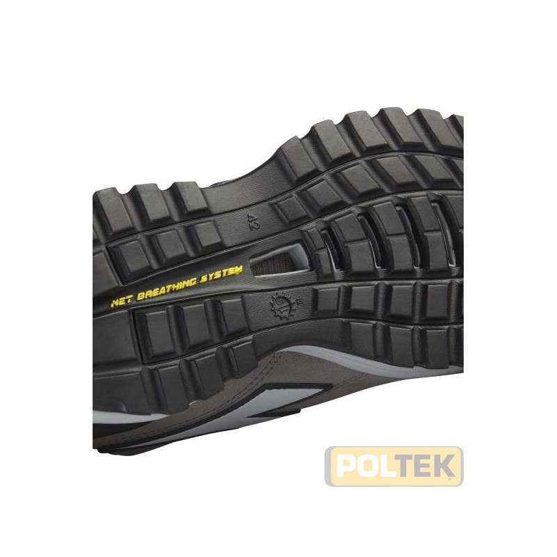 Calzatura di sicurezza bassa S3L idrorepellente in Perwanger, pelle bovina scamosciata antigraffio, traspirante. Supporto ergonomico del tallone in TPU. Puntale in alluminio 200J. Inserto antiperforazione K SOLE BREATHABLE. Calzata 11. Tecnologia di traspirazione Net Breathing System by Geox. Fodera 3D a camino per maggiore traspirazione ed antiscalzantein microfibra. Plantare anatomico, antistatico estraibile in PU espanso riciclato a celle aperte, traspirante con carboni attivi. ESD