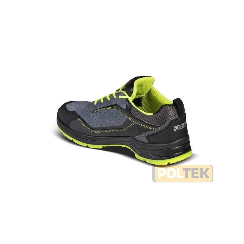 Calzatura di sicurezza conforme alla nuova EN ISO 20345:2022, in pregiata pelle scamosciata traforata, rinforzo in microfibra su punta e tallone, suola in poliuretano bi-densità "FLEXGRIP+" con speciale tacco conforme ai requisiti per le scale a pioli (ladder grip - LG).