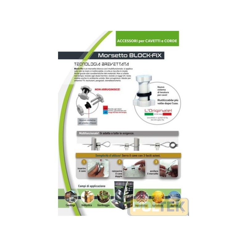Morsetto blocca cavi multifunzionale, si applica solo con le mani, e' riutilizzabile, si svita e riavvita in modo facile grazie alle caratteristiche dei materiali. Non si sfalda nel tempo, resiste agli sbalzi termici, resiste ai raggi U.V., resta stabile anche in ambiente umido. Non arruginisce, ideale per antenne TV, recinzioni, pergolati, stendibiancheria.
