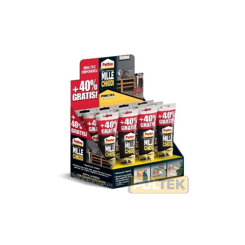CAMPI DI IMPIEGO Prodotto caratterizzato da una notevolissima forza adesiva iniziale (effetto ventosa) e da un ottimo potere riempitivo (fino a 1 cm). E' ideale per fissare, in interni, zoccolini in legno, piani d'appoggio e da lavoro, perline, angolari, pannelli decorativi, pannelli gessati, rivestimenti in moquette, polistirolo, metallo trattato antiruggine, ceramica, mattoni, calcestruzzo, sughero, linoleum e plastica (escluso PP, PE, PTFE). Almeno una delle due superfici deve essere assorbente. Utile per la riparazione di moquette e piccoli listelli di parquet. Il prodotto polimerizzato è sovraverniciabile. Pattex Millechiodi Original può essere applicato anche su superfici umide e rimane elastico nel tempo.