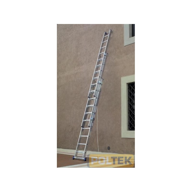 Scala sfilabile in tre tronchi. In alluminio elettrosaldato. Il dispositivo di sollevamento a corda permette di sol-levare il secondo elemento. La scale a corda possono essere usate solo in posizione allungata.