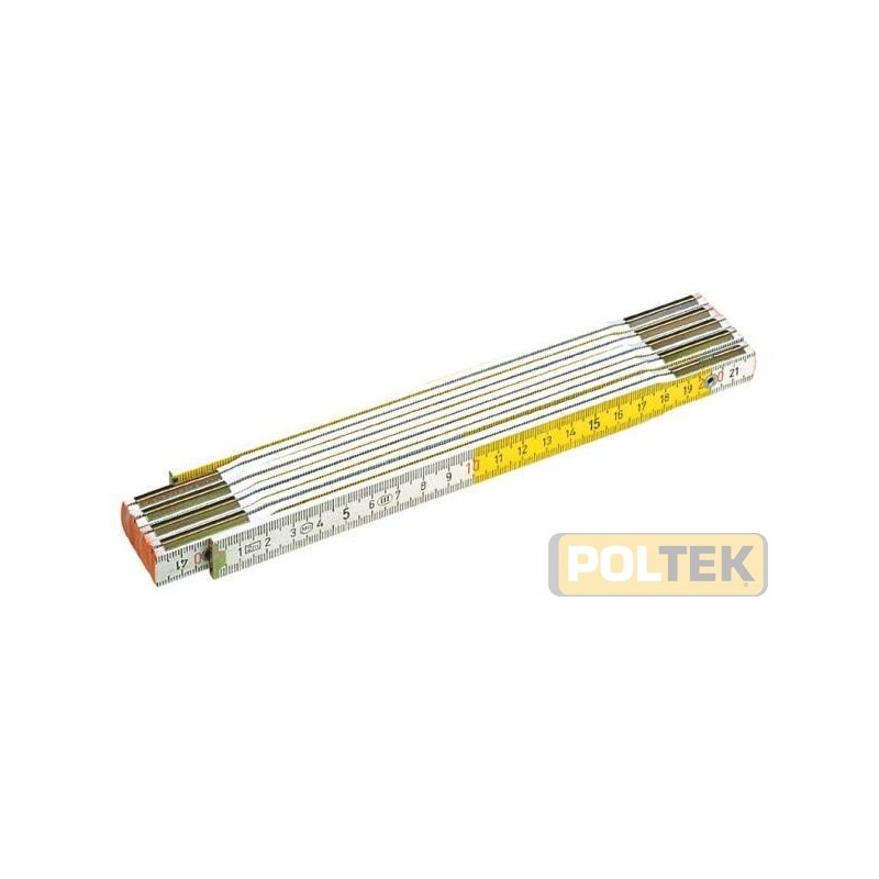 Doppi metri colorati in legno a dieci aste. Legno di carpino di prima scelta. Doppia scala millimetrata stampata in colore nero in profondità. Doppia protezione della superficie per mezzo di vernice trasparente. Stecche con larghezza di 16 mm e spessore di 3 mm. Snodi, i primi graduati, in acciaio antiruggine e lubrificati in fase di montaggio. Lunghezza nominale dello strumento: 2 metri.