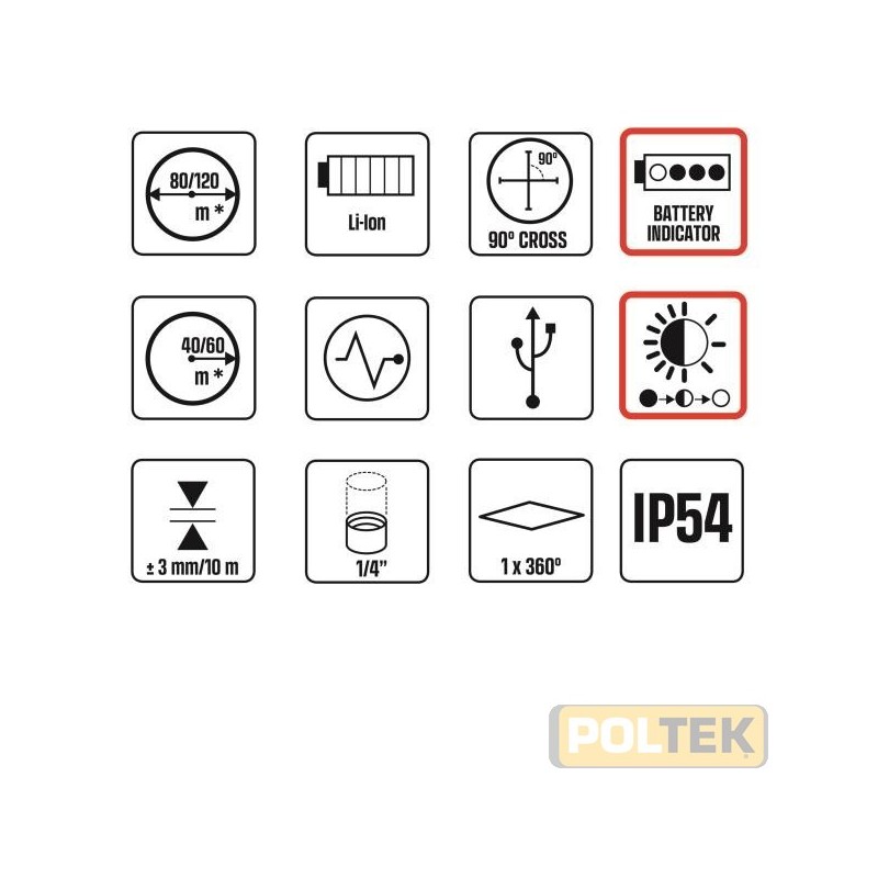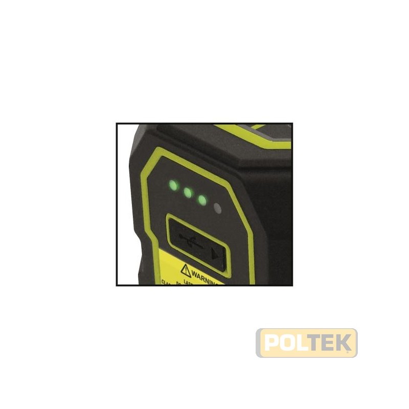 CARATTERISTICHE TECNICHE Portata interno / esterno 30 m / 50 m Precisione di livellamento ±3mm / 10m Campo di autolivellamento 4°±1° Segnale di fuori livellamento si Potenza laser classe Tipo di laser 505~550nm Alimentazione Li-ion 3.7V 4400 mAh Dimensione 104x83x83mm Peso 450 g Impermeabilità IP 54 Vite per attacco treppiedi 1/4"