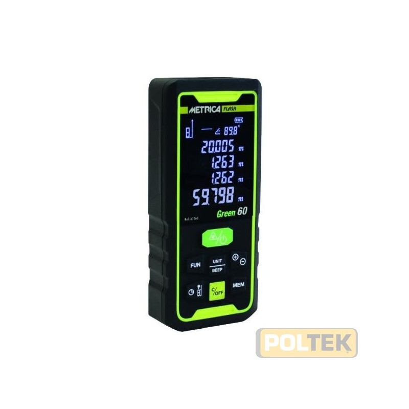 Laser verde per una migliore visione Inclinometro digitale, Fiala elettronica Funzione misurazione continua, con valori max/min sempre visualizzati 4 funzioni di Pitagora (misura indiretta) Distanze, superfici, volumi Somma e sottrazione di distanze, superfici e volumi Timer di misura, autospegnimento Ritardo nella misurazione impostabile Funzione sonora: beep 99 memorie Batterie ricaricabili Cavetto ricarica Filetto 1/4" per attacco treppiede Con cinghietta, in astuccio