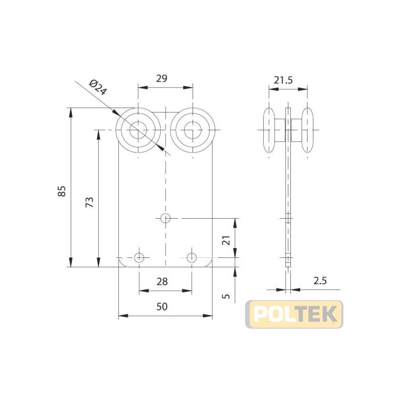 Carrelli per carichi appesi, a quattro ruote con staffa larga. A fissare mediante appositi fori di fissaggio. Materiale acciaio zincato elettroliticamente.