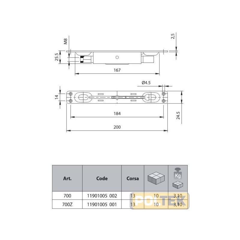 Catenaccio di sicurezza per il bloccaggio di un'anta in chiusura, ad incasso doppia mandata leva ottone. A fissare sull'apposito incasso ricavato sull'anta. Materiale acciaio zincato elettroliticamente (leva ottone).