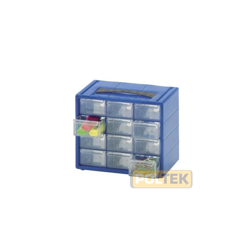Cassettiera monoblocco porta minuteria con 12 cassetti e 12 divisori estraibili in dotazione. Corpo in PEHD (Polietilene ad alta densità) di colore blu e cassetti in PP (Polipropilene) trasparente.
