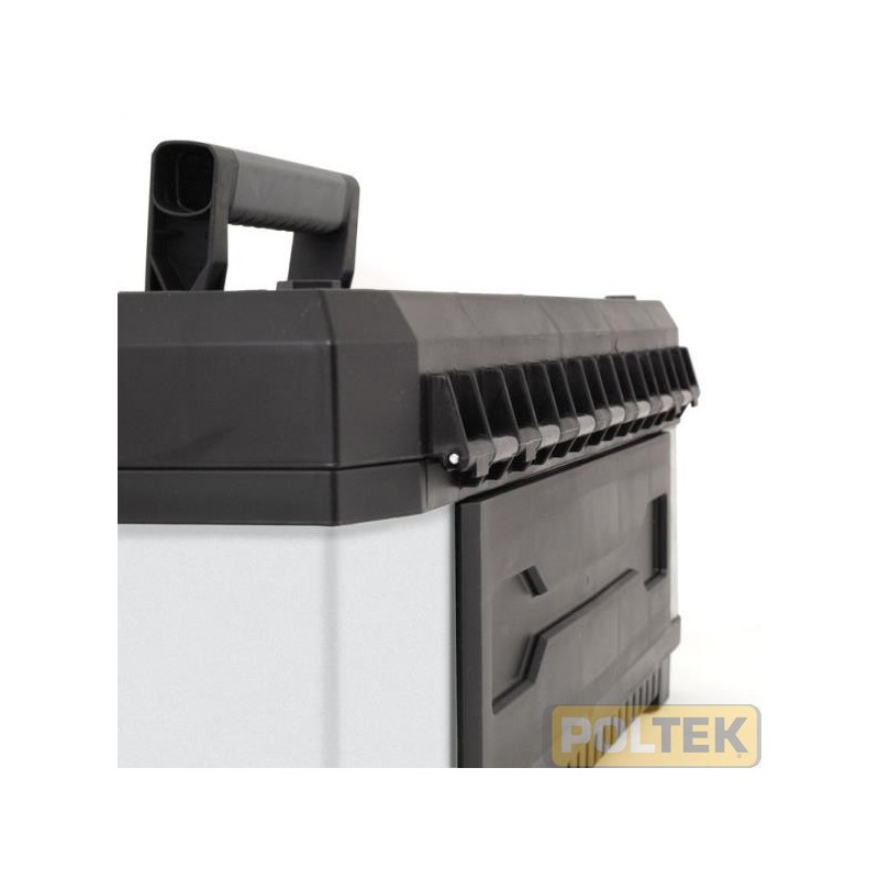 Corpo in metallo molto spazioso. Vaschetta. Coperchio con scanalatura a "V" per il taglio di assi. Innovativo sistema di alloggiamenti verticali porta-utensili.