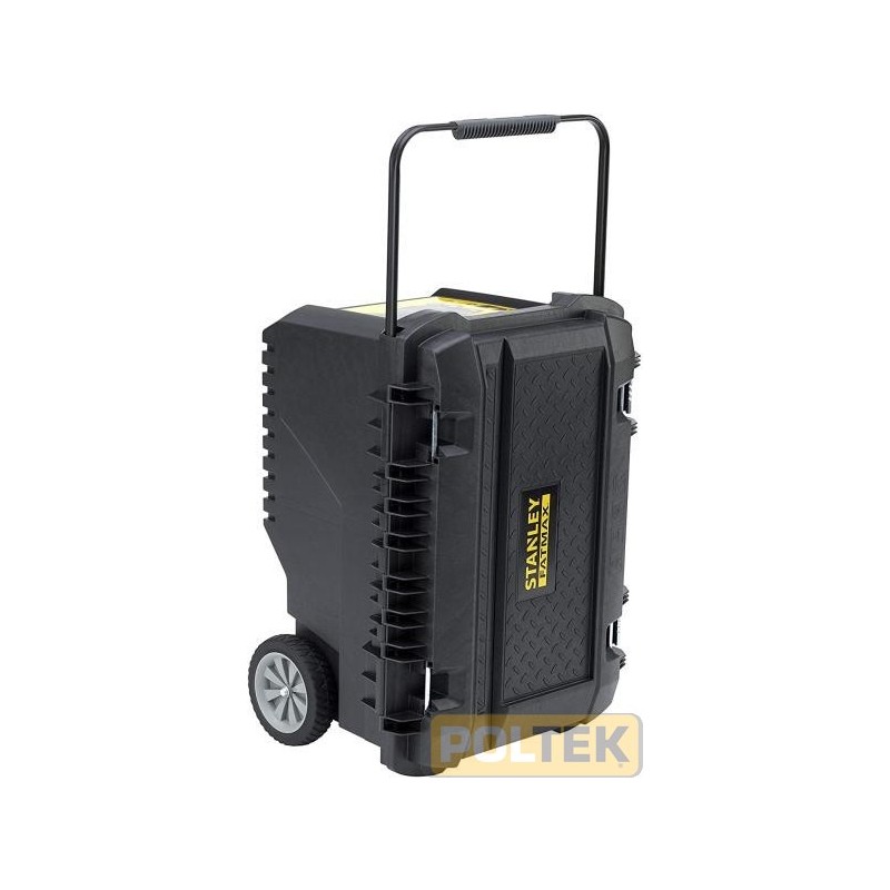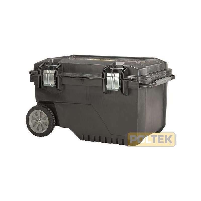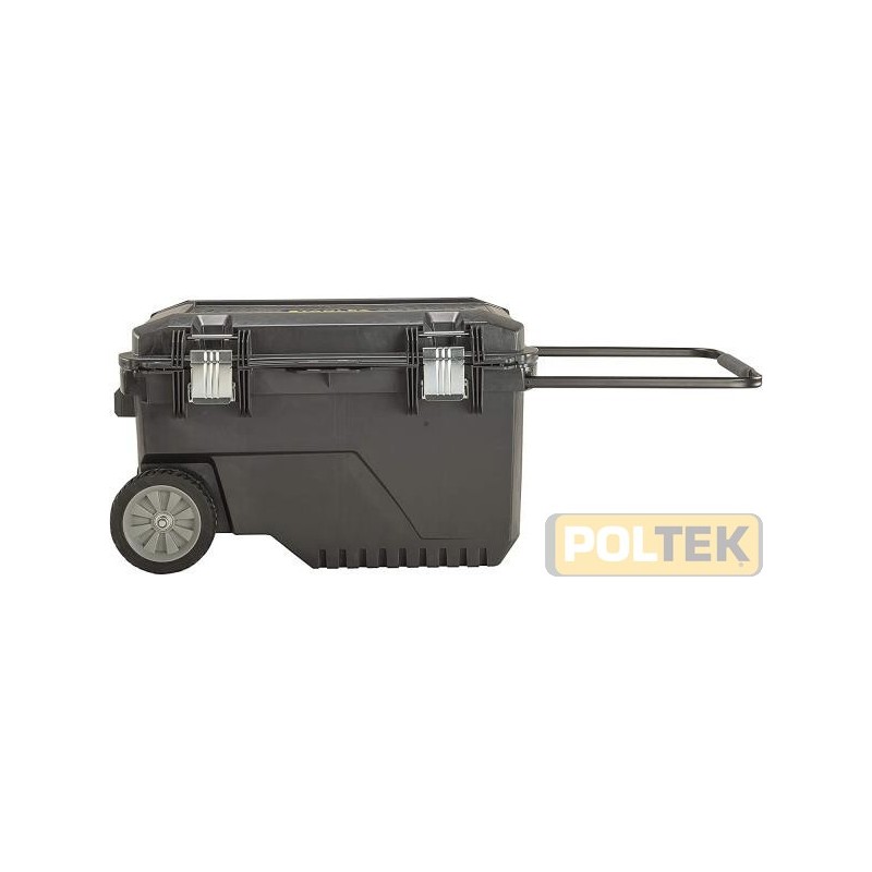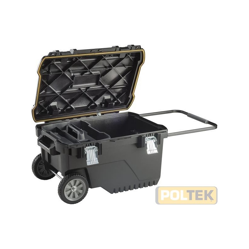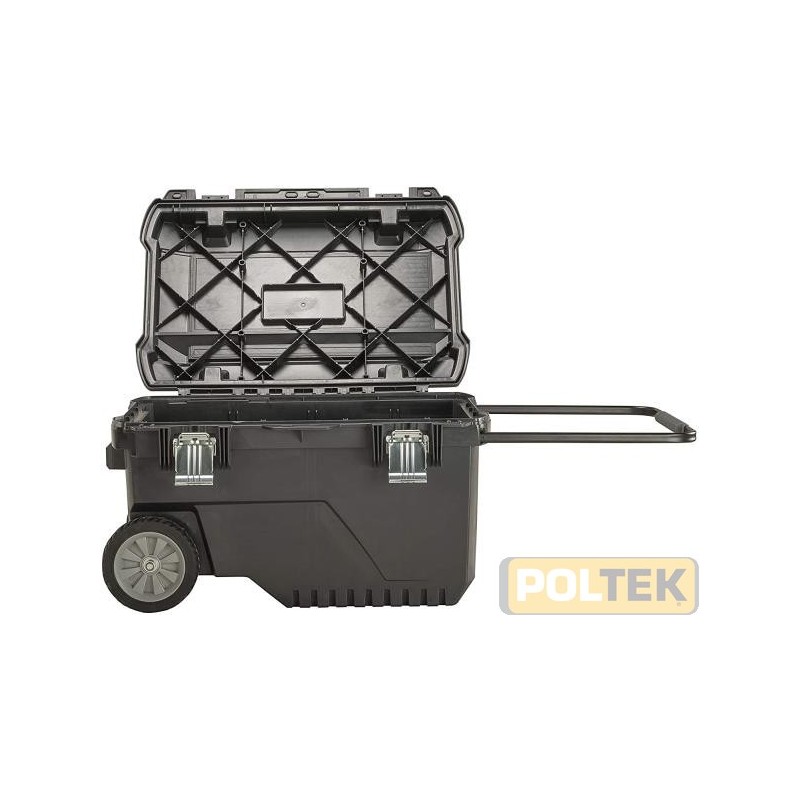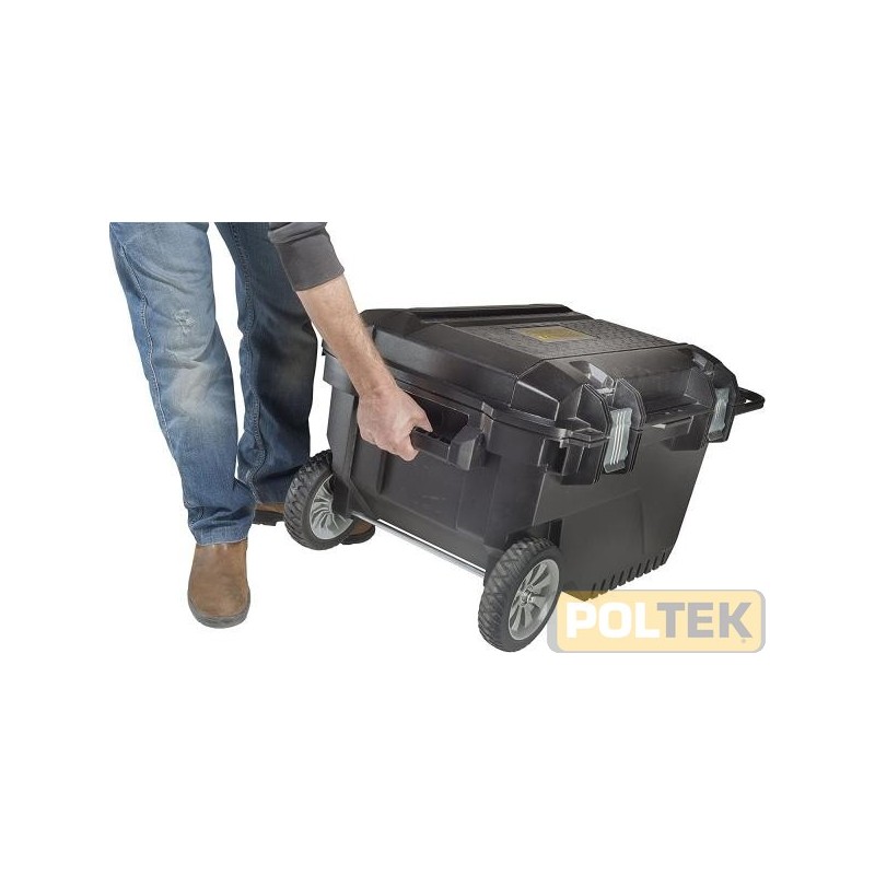 In polipropilene. Eccellente manovrabilità grazie al fondo sollevato da terra. Ruote da 7" rivestite in gomma, maniglione posteriore in metallo. Coperchio con inserti in metallo e scanalatura a "V" per il taglio di assi. Vaschetta removibile. Guarnizione a protezione di umidità e polvere. Alloggiamento verticale asportabile per utensili a mano.