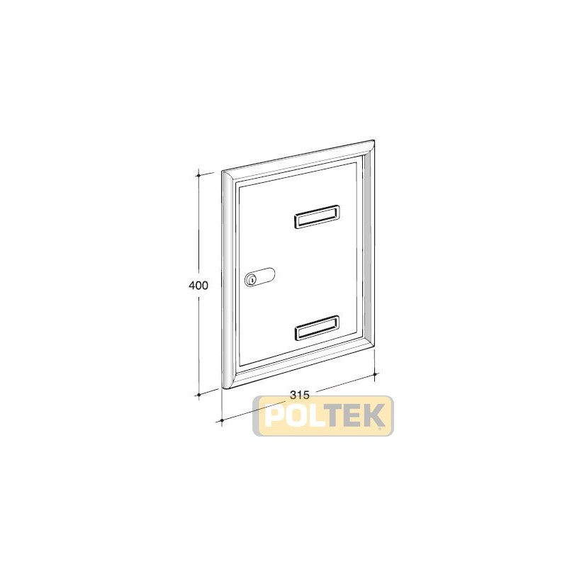 Porta di grandi dimensioni per esterno da incasso a muro (misure foro 280x365 mm) realizzata in alluminio silver o verniciato grigio ferro, pensata per l'abbinamento con le placche. Dotata di cornice coprifuga e parapioggia per una buona resistenza agli agenti atmosferici, porta con apertura a libro per il ritiro della posta.