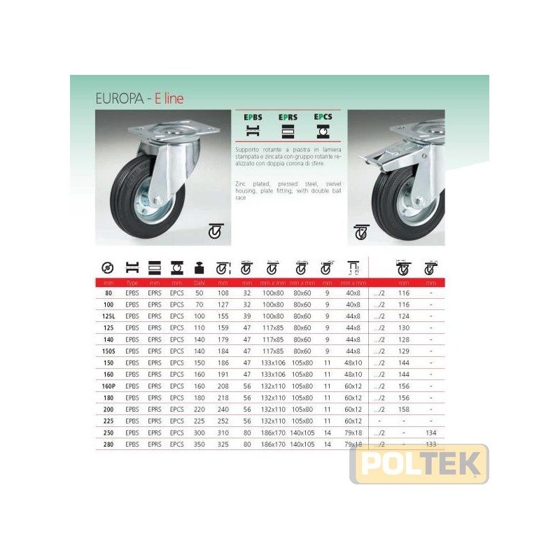 Ruota con supporto rotante a piastra in lamiera stampata e zincata. Gruppo rotante realizzato con doppia corona di sfere. Anello in gomma piena a profilo trapezoidale nero. Nucleo portante in lamiera stampata e zincata.