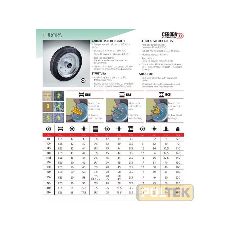 Caratteristiche tecniche: Mozzo con boccola in poliammide Temperatura di utilizzo da -20° a +60°C Durezza anello 85 ± 4 Shore A Velocità massima di lavoro 4km/h Ideale per carrelli a traslazione manualieper carichi medi Teme il contatto con grassi, olii, idrocarburi, solventi clorurarìti ed aromatici.