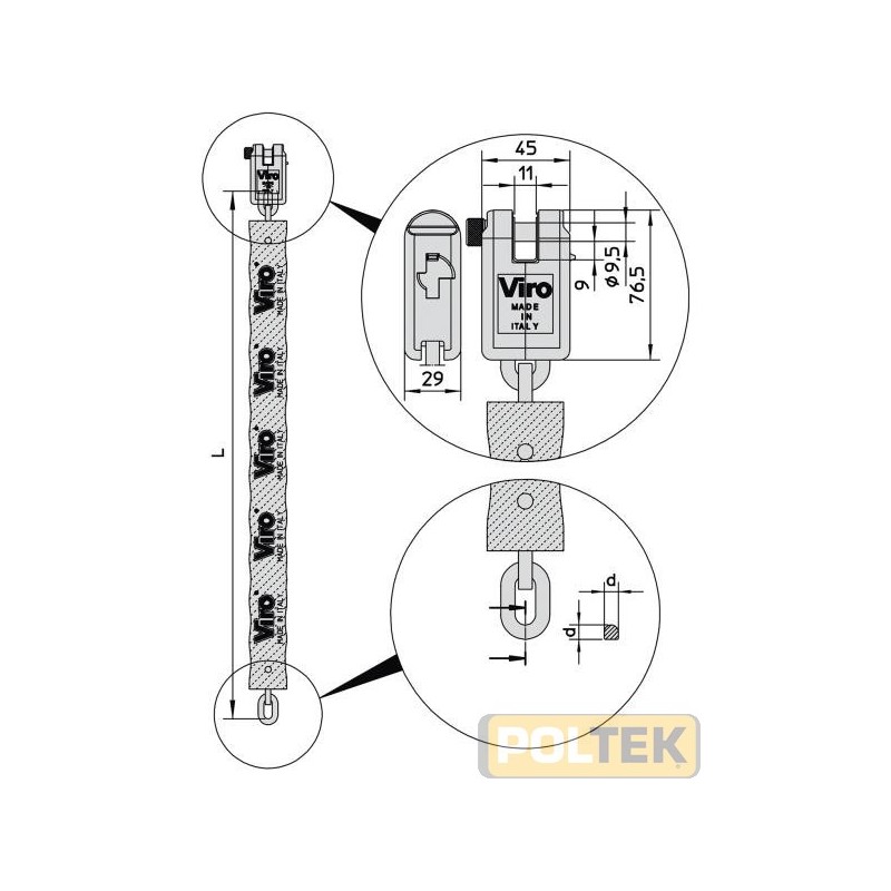 Catena: semiquadra (per contrastare le troncatrici manuali che hanno generalmente lame taglienti adatte a trattenere i profili tondi) in acciaio speciale (al manganese) cementato, temprato, rinvenuto e zincato. La catena ha sezione 7 mm., è rivettata al SUPERMORSO con un perno in acciaio inox e ricoperta da guaina di protezione di colore blu, in tessuto che minimizza l'ingombro e antigraffio.