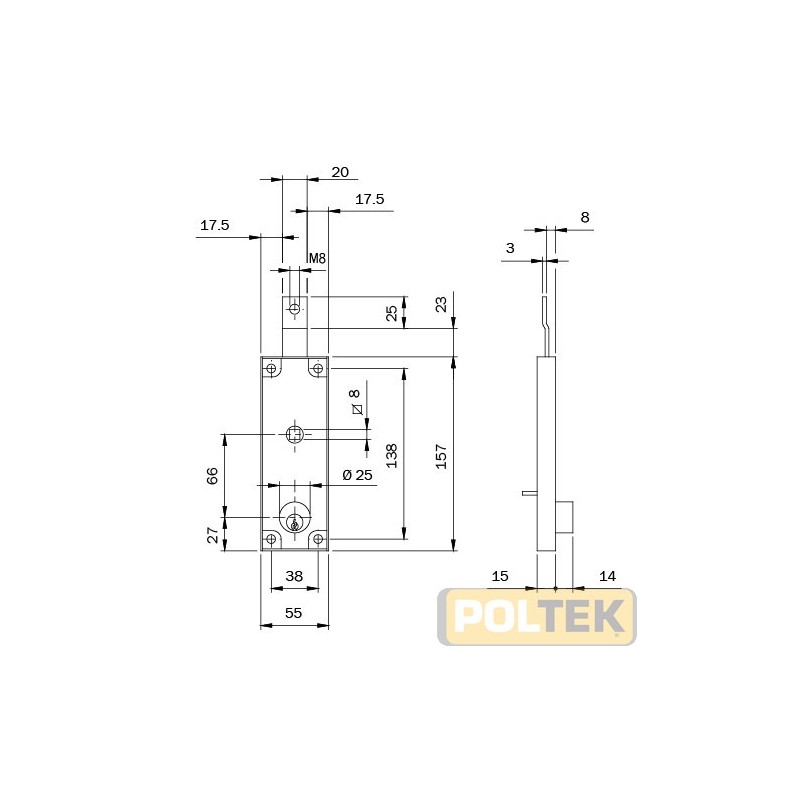 Serratura per serranda. Applicazione verticale. Scatola verniciata. CATENACCIO zincato con FORO FILETTATO M8 PER AGGANCIO ASTA. 1 mandata da mm 25 con maniglia, QUADRO MANIGLIA mm 8, sbloccaggio maniglia con cilindro tondo Ø mm 25 dall'esterno e con levetta dall'interno. Cilindro sporgente dalla scatola serratura di mm 14. 2 CHIAVI A PROFILO STANDARD (chiave grezza codice 020259).