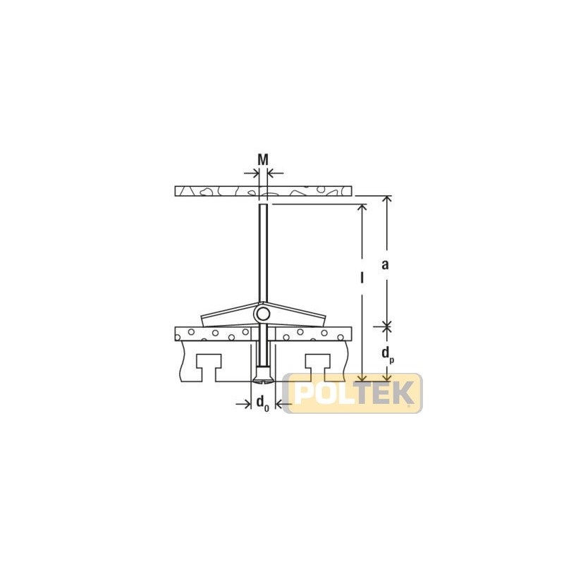 Ancora in acciaio per supporti forati con dado in ottone zigrinato taglio cacciavite. Diametro foro mm 14 Vite (Ø x lunghezza) mm M4x100 Massimo spessore parete mm 69