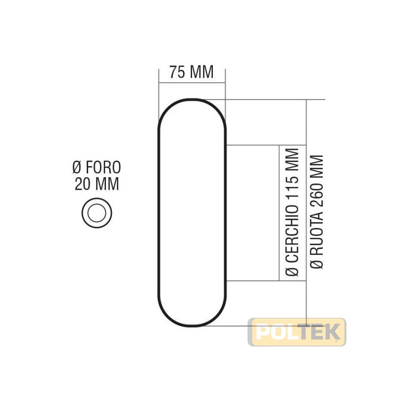 Ruota con nucleo in plastica. Copertura con mescola a bassa densità imperforabile. Velocità max 4 km/h. Mozzo con cuscinetto a rullino. Diametro foro mozzo mm.20. Lunghezza mozzo mm.70.