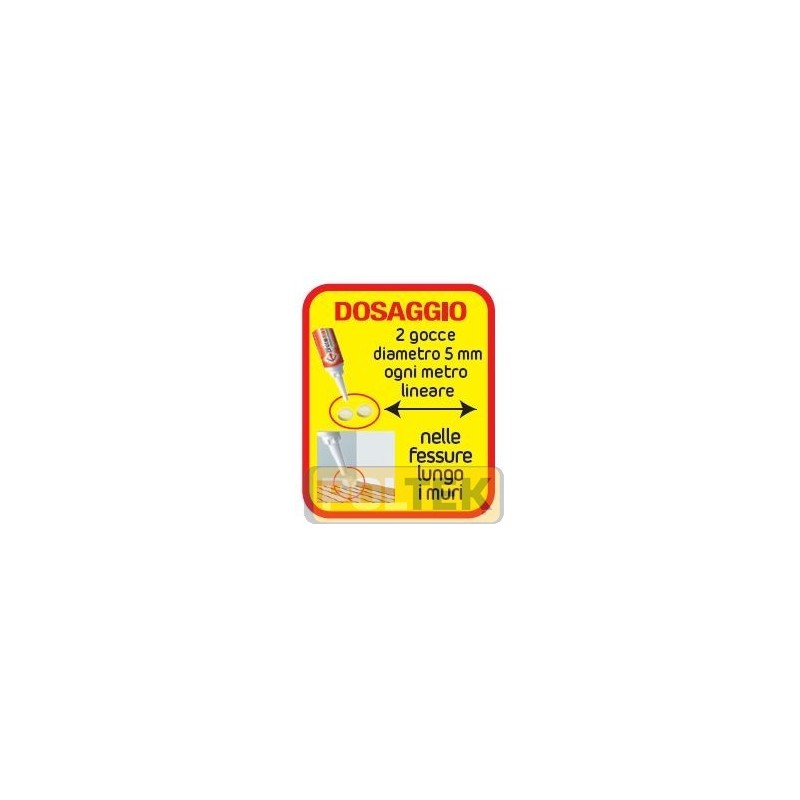Dose: 2 gocce da 0,05 g (5 mm di diametro) ogni metro lineare o per ogni entrata di formicaio. Applicare al massimo 30 gocce da 0,05 g per formicaio (pari a 1,5 g di prodotto).