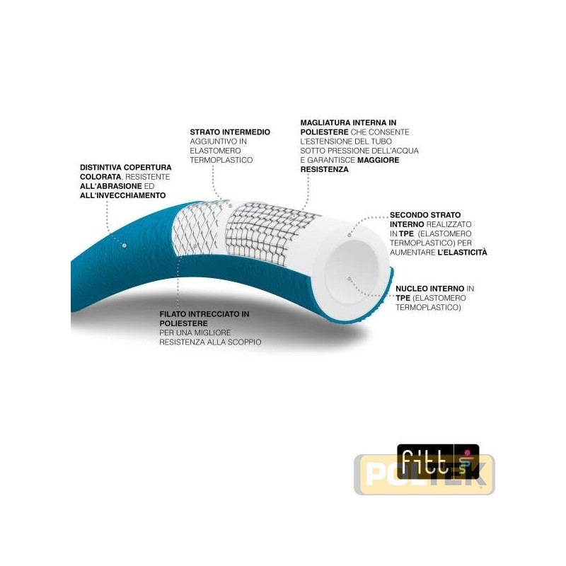 - L'unico tubo estensibile sul mercato realizzati in TPE (elastomero termoplastico) con due intrecci interni di filato che ne controllano l'espansione e l'estensione