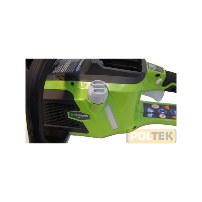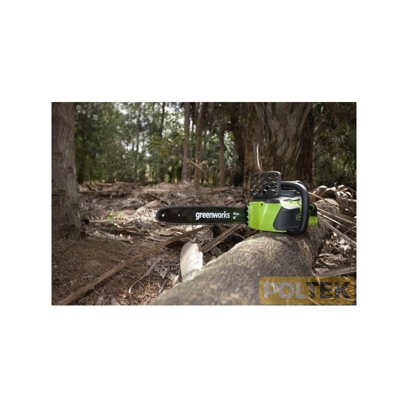 La nuova motosega Greenworks con la barra da 40 cm rende performante ed eccezionale questa motosega per tagliare alberi più piccoli e rami non di grosse dimensioni. L'interruttore di avvio istantaneo contribuisce a una gestione rapida, senza complicazioni, inoltre la bassa rumorosità consente di lavorare senza disturbare i vicini, perfetta per le zone residenziali. Grazie al suo motore brushless, la motosega offre fino al 30 percento in più di potenza. Un'operazione di sicurezza a due pulsanti garantisce e protegge da eventuali avviamenti accidentali.