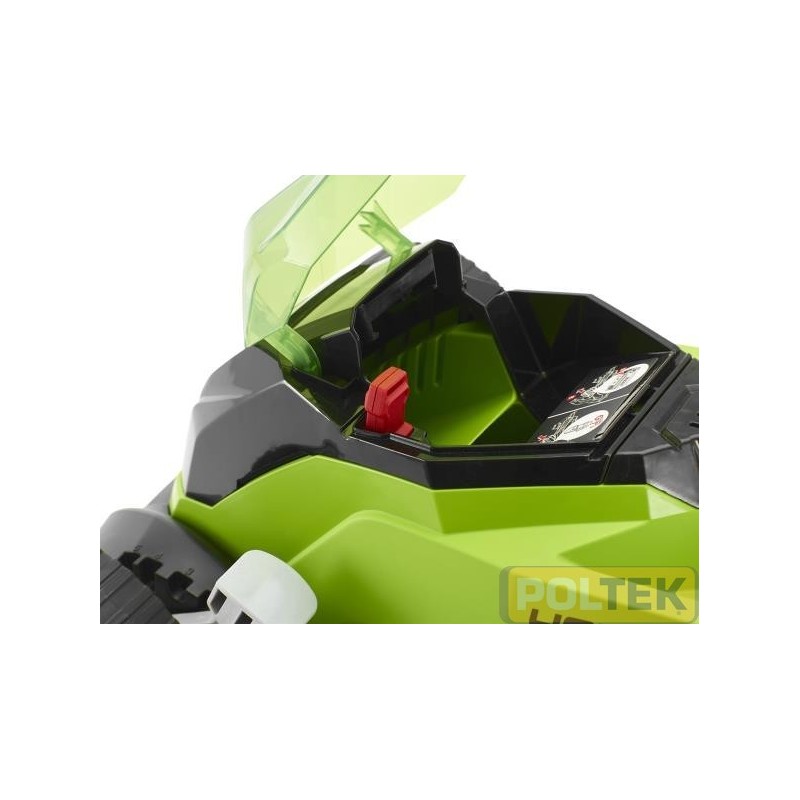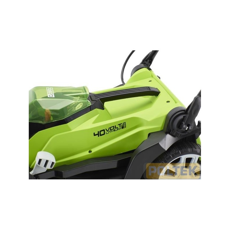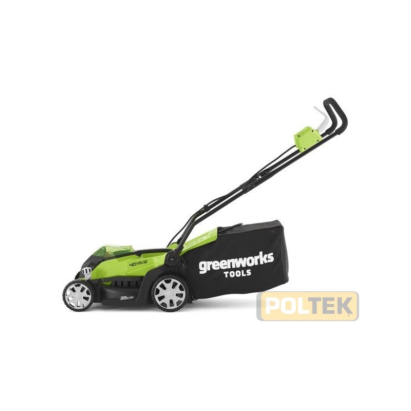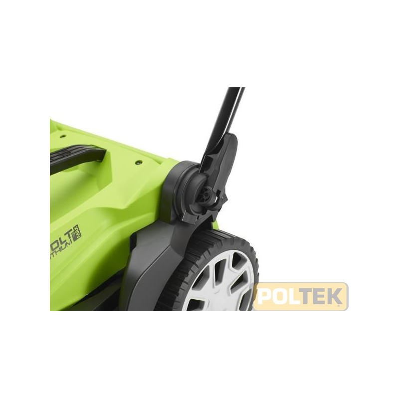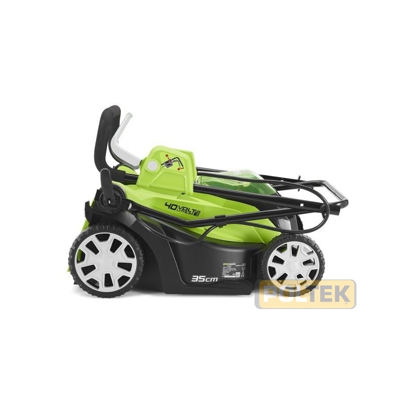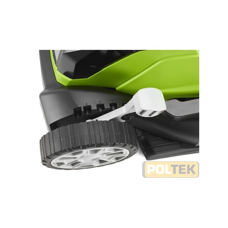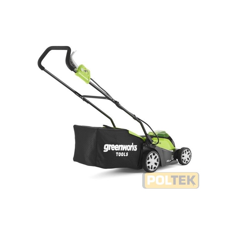 2 in 1: taglio con raccolta, mulching Impugnatura ergonomica, puo essere riposto in spazi stretti Chiave di sicurezza Lama in acciaio da 35 cm con tecnologia di protezione del motore da eventuali collisioni Durevole piatto di taglio composito