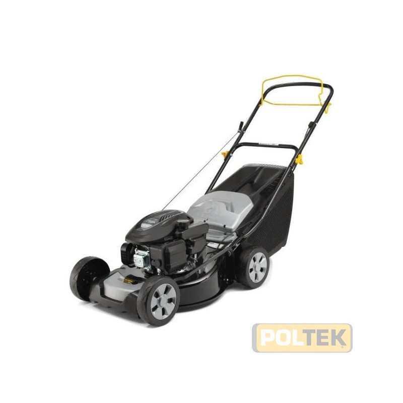 Tagliaerba a trazione con motore a scoppio da 125 cc, larghezza di taglio da 46 cm e sacco di raccolta da 60 L.