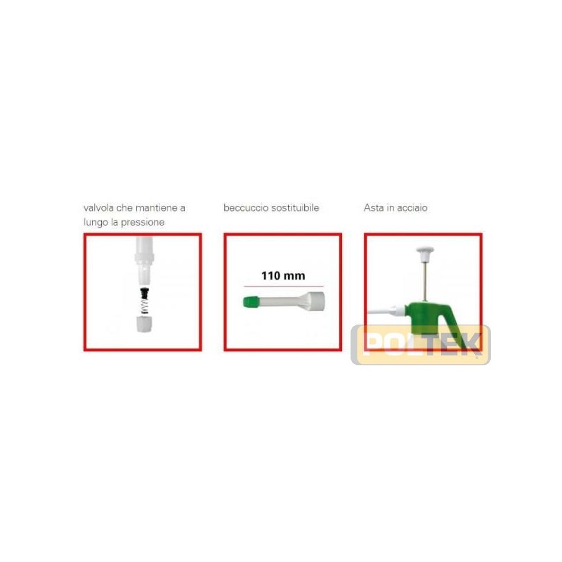 Pompa ad accumulo pressione, pratica e robusta. Costruita con materiali tecnologicamente avanzati, ha una lancia molto lunga e non richiede particolari manutenzioni oltre all'ordinario risciacquo a fine impiego. Utile in casa, sul balcone, in giardino e nelle attività hobbistiche quando serve vaporizzare liquidi con particolare accuratezza e qualità di nebulizzazione.