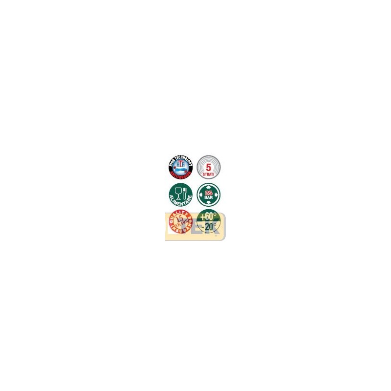 Tubo con rinforzo magliato di elevata qualità destinato all'utilizzo domestico e professionale. Processo di fabbricazione "HIGH TECHNOLOGY ANTITORSION". Struttura a 5 strati. Rinforzo magliato trrico. Rinforzo 12 fili in poliestere ad alta tenacità, antitorsione. Qualità alimentare. Privo di Cadmio, Bario, Piombo. Stabilizzato UV. Antialga.