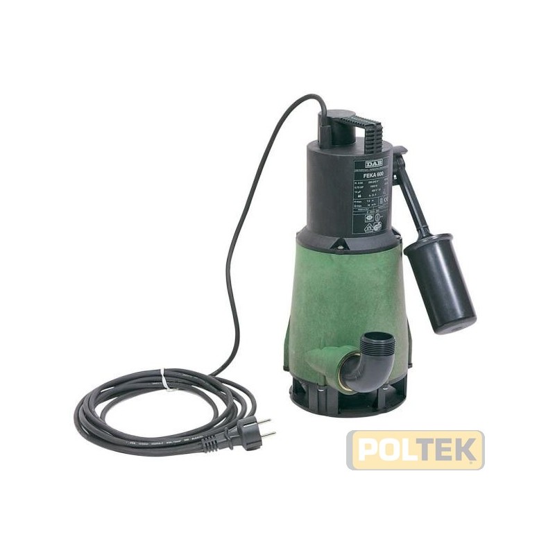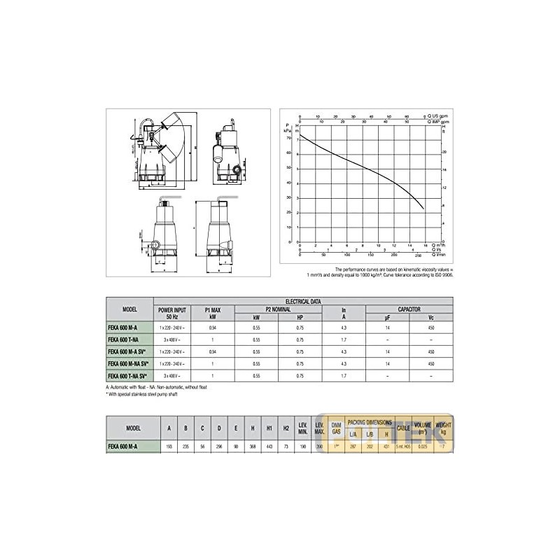 Caratteristiche Cavi di serie: 5 metri H05RN-F per: FEKA 600 M-A Spina di tipo SCHUKO CEE 7 di serie per la versione monofase. Campo di funzionamento: da 1 a 16 m3/h con prevalenze fino a 7,45 metri. Campo di temperatura del liquido: da 0°C a +35°C per uso domestico. Liquido pompato: acque luride da fossa biologica. Granulometria di passaggio attraverso la griglia di aspirazione: 25 mm. Profondità min. di pescaggio: 175 mm. Immersione massima: 7 metri. Tempo massimo di funzionamento a secco: 1 minuto. Grado di protezione: IP 68. Classe di isolamento: F.