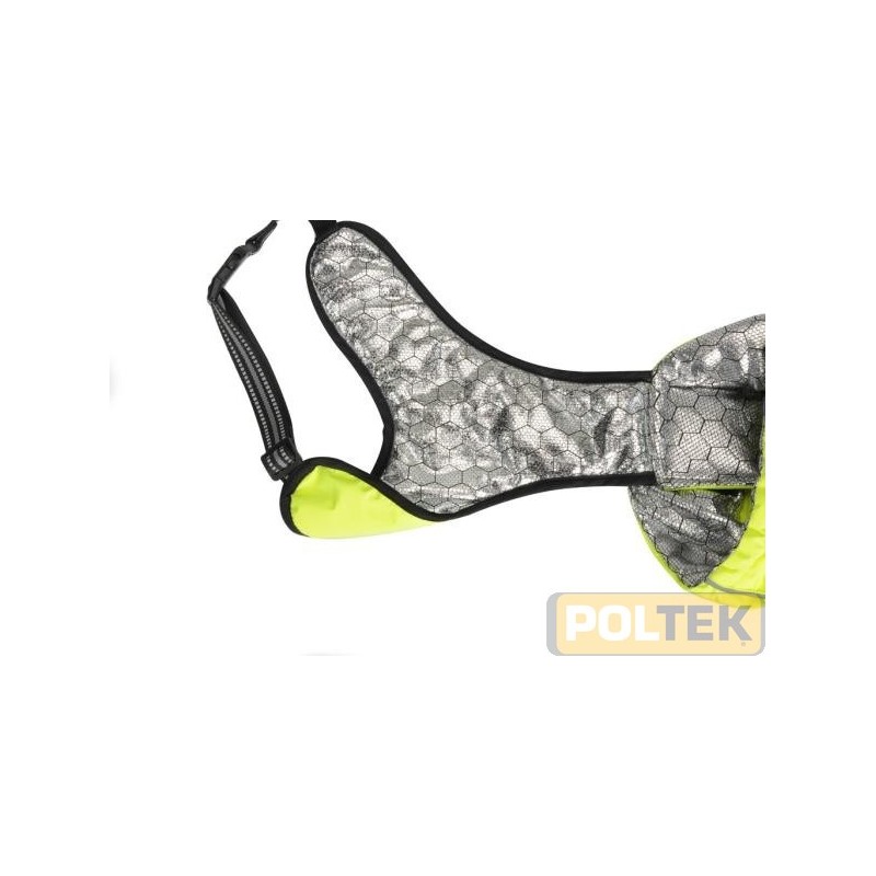 Impermeabile in tessuto tecnico, waterproof e windproof, con interno termico. Dotato di piping catarifrangenti, di coulisse per regolare l'ampiezza del collo e di ulteriore coulisse laterale per la parte posteriore. Apertura in velcro sul collo, chiusura fasciante con laccio regolabile catarifrangente e moschettone sulla schiena.