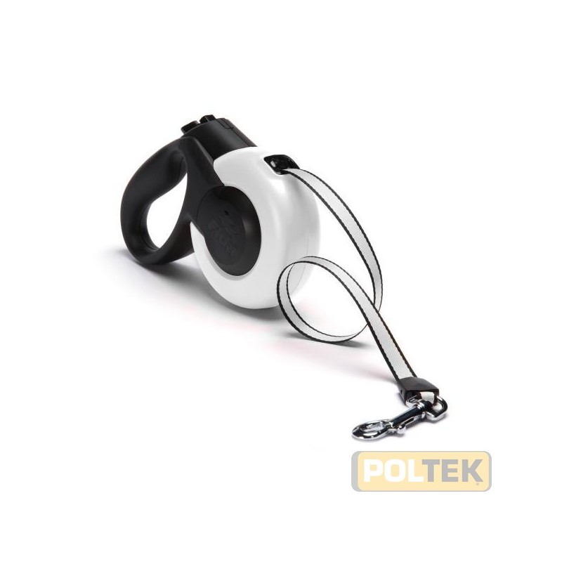 Maniglia ergonomica, bottone di controllo delle funzioni semplice e rapido che permette tre tipi di utilizzo: libero, blocco temporaneo o blocco permanente alla lunghezza desiderata. Impugnatura ergonomica con morbido materiale antiscivolo. La fettuccia o la corda scorrono con un sistema che impedisce l'attorcigliamento. Cordino di 5 metri per cani fino a un massimo di 15 kg. I guinzagli sono garantiti due anni.