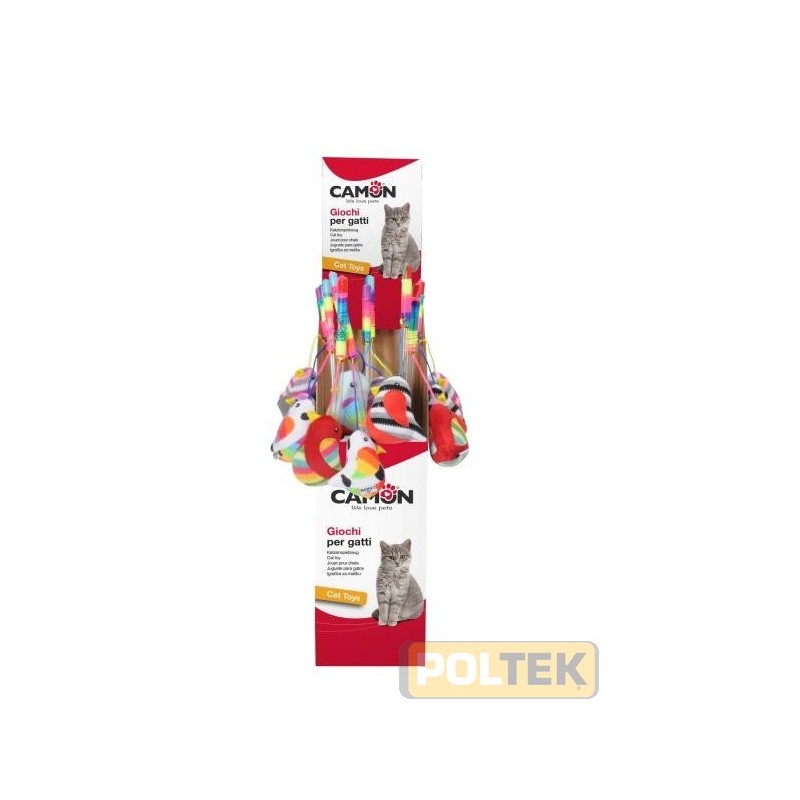 Simpatici giochi per gatto costituiti da una cannetta nella quale estremità è legato un piccolo volatile oppure un piccolo topolino. Coloratissimi, garantiranno un duraturo divertimento al vostro felino.