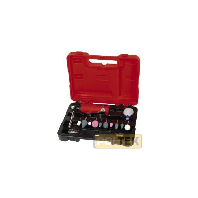 Dispositivo pneumatico per smerigliatura, lucidatura, incisione e sbavatura L'impugnatura gommata antiscivolo garantisce la massima sicurezza nel lavoro Massime prestazioni a partire da un diametro interno del tubo flessibile di 9 mm La smerigliatrice può essere usata con una sola mano Il dispositivo di sicurezza di cui è dotata impedisce l'accensione accidentale dell'apparecchio Incl. 10 perni di levigatura per numerose applicazioni Include 1 boccetta d'olio, 1 raccordo rapido e 2 chiavi a brugola Fornita con valigetta di custodia e trasporto
