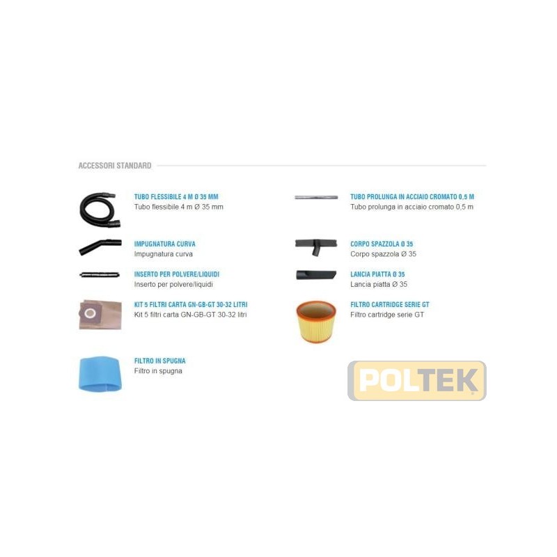 Caratteristiche tecniche: Motore da W 1400. Capacità lt.30. Portata d'aria l/s 70. Depressione mm. H2O: 2700