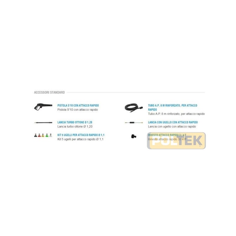Dotazione standard: Pistola alta pressione con attacco rapido, lancia portaugelli con attacco rapido, lancia turbo, tubo A.P. m. 8 rinforzato, 5 ugelli.